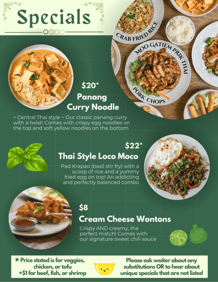 - Price will be determined based on which protein you choose. If a dish is ordered as vegetarian or with just veggies, broccoli will be added in place of a protein (exception being the Ong Bak dish)