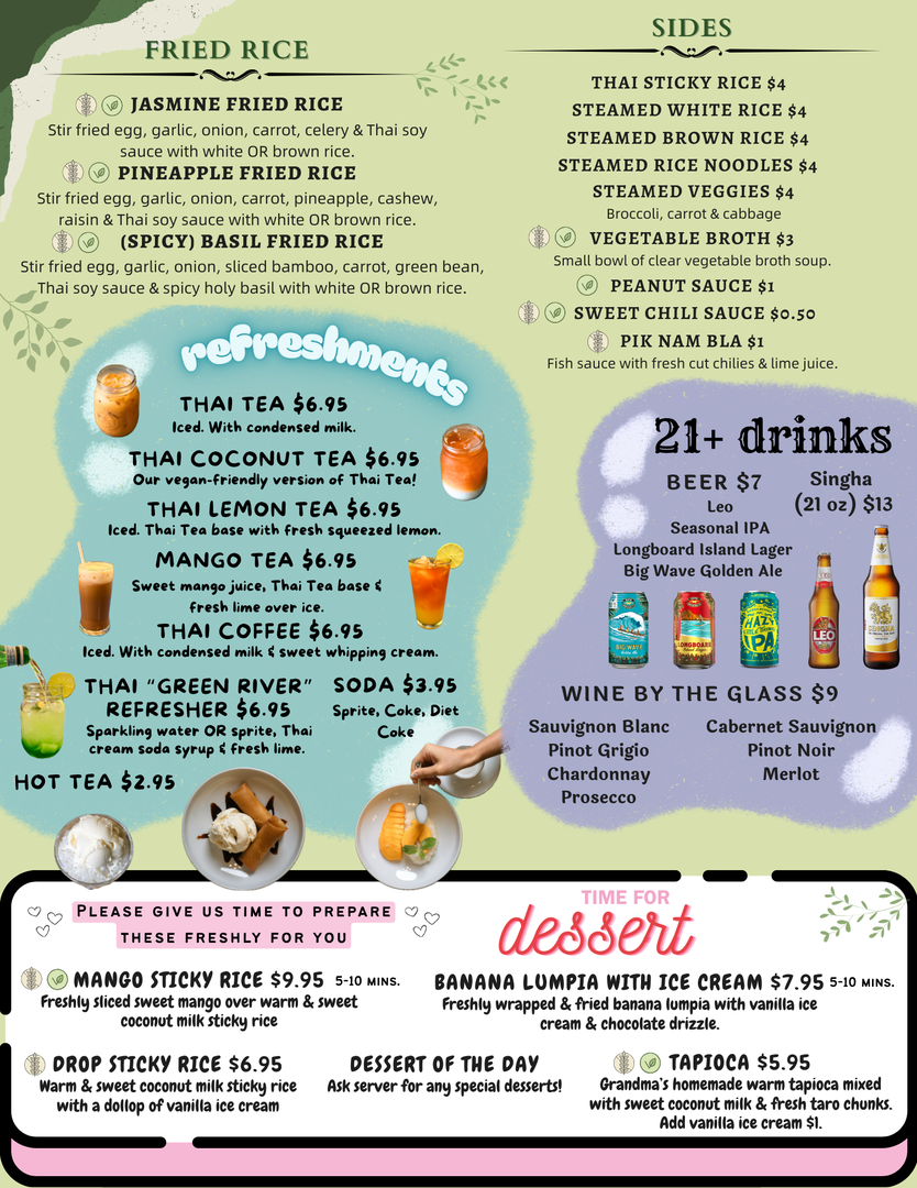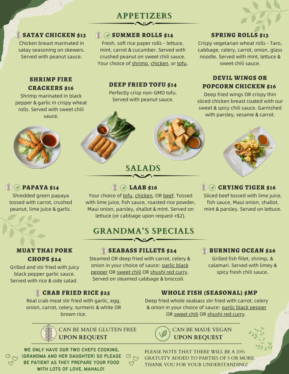 - PLEASE choose your spice level carefully as Thai food can get pretty hot! We can definitely give you extra spice on the side but we are unable to remove it once cooked in. Mahalo for your understanding :)